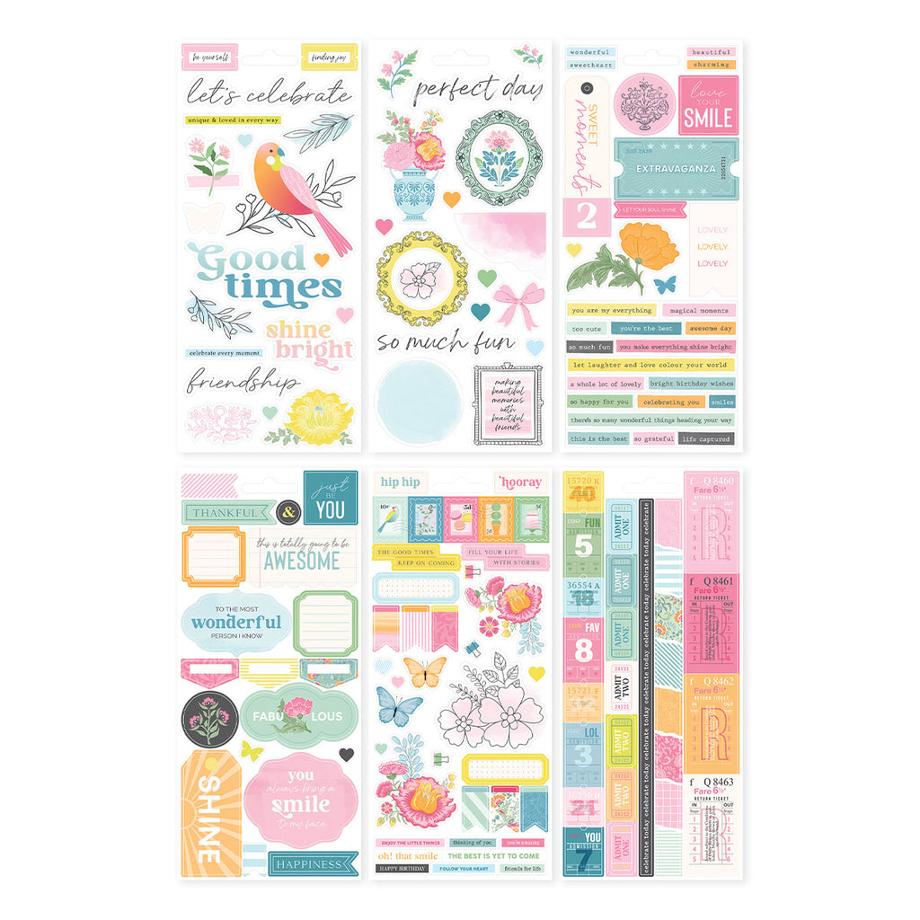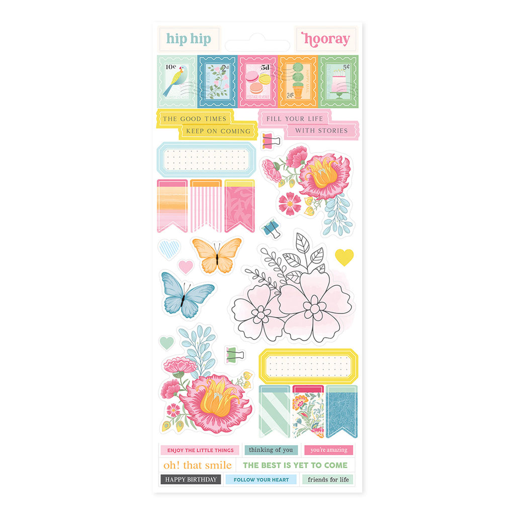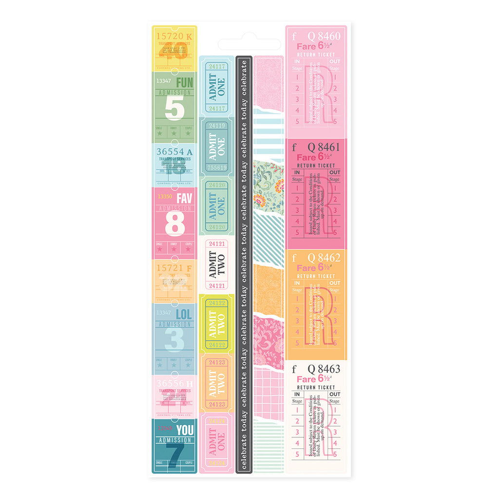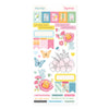 Rosie’s Studio Jubilee Sticker Book that comes in six sheets: two sheets of paper stickers, two sheets of clear stickers and two sheets of washi tape strips. Mix and match from this book to give you interest and beautiful accents on your cards, scrapbook page, planner and more!