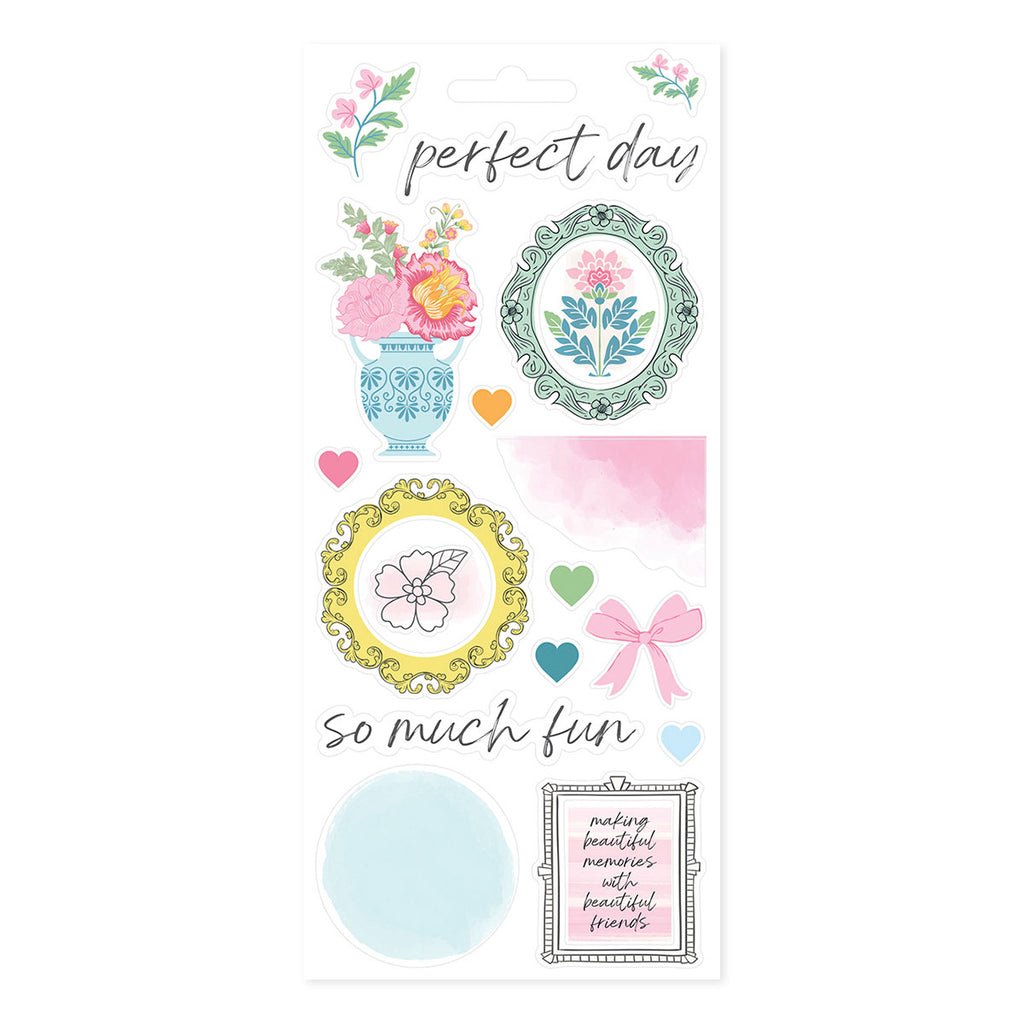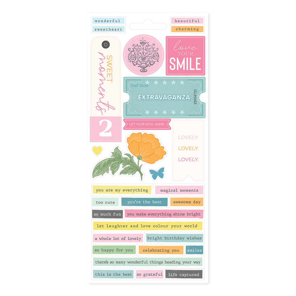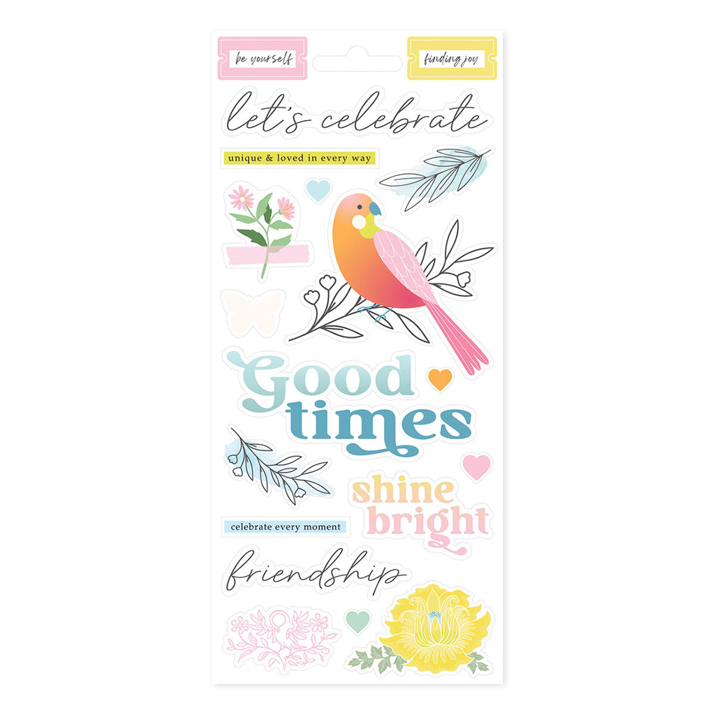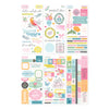 Rosie’s Studio Jubilee Sticker Book that comes in six sheets: two sheets of paper stickers, two sheets of clear stickers and two sheets of washi tape strips. Mix and match from this book to give you interest and beautiful accents on your cards, scrapbook page, planner and more!