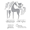 Good Fortune Horse Clear Stamp & Die Set assembles a wonderful and detailed horse with the nine thin metal cutting dies. The finished horse measures 2.70 x 3.70 in./6.80 x 9.30 cm. The four clear sentiment stamps are Charge into new adventures with bold spirit!, Hope your year is wild + free, Cheers to a strong and spirited new year, and Sending you endless joy and good fortune. What a fabulous way to celebrate 2026 and beyond!