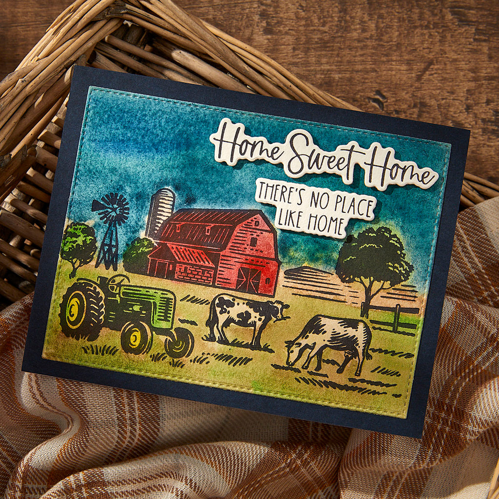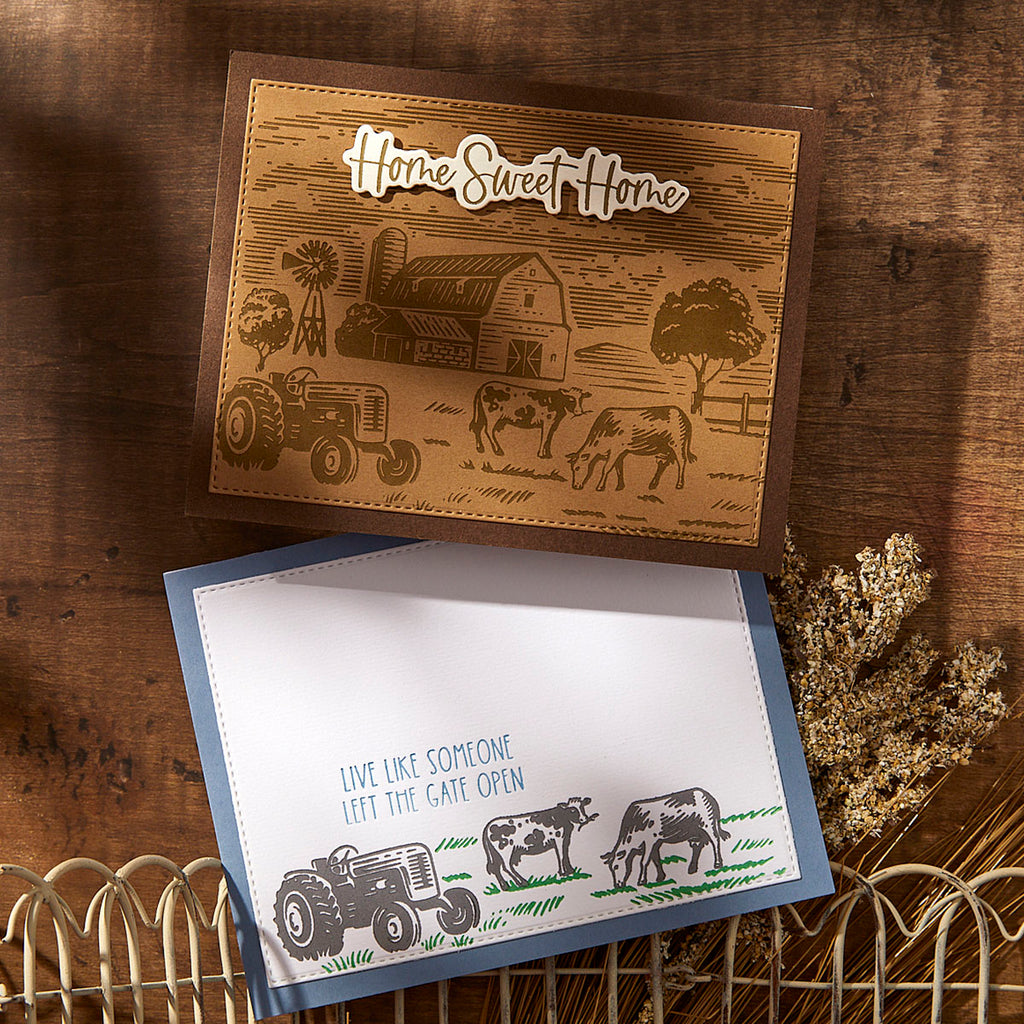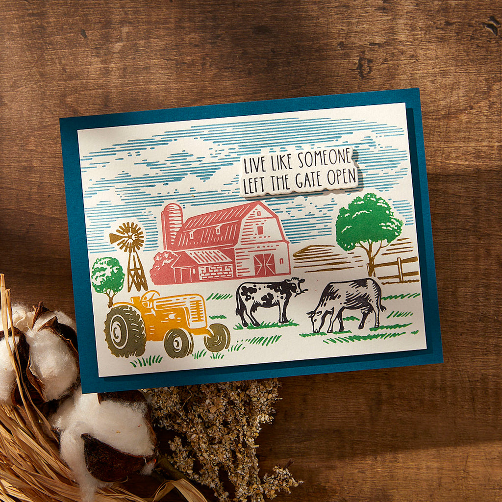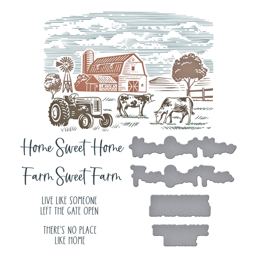 Farm Sweet Farm Registration BetterPress Plate & Die Set is part of the Justine's Farm Collection by Justine Dvorak. Create a peaceful farmhouse scene with this set of fourteen press plates, a clear acetate registration template for perfect placement and four thin metal cutting dies to cute out the sentiment. Let the registration mylar sheet guide you in making this scene come to life in color. Finish off with a choice of four sentiments that can be cut with the matching dies: Home Sweet Home, Farm Sweet Farm, Live Like Someone Left the Gate Open, and There’s no Place like Home.