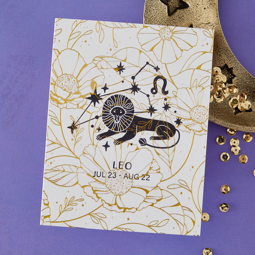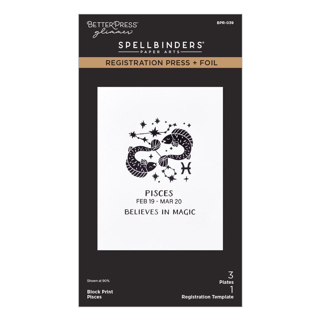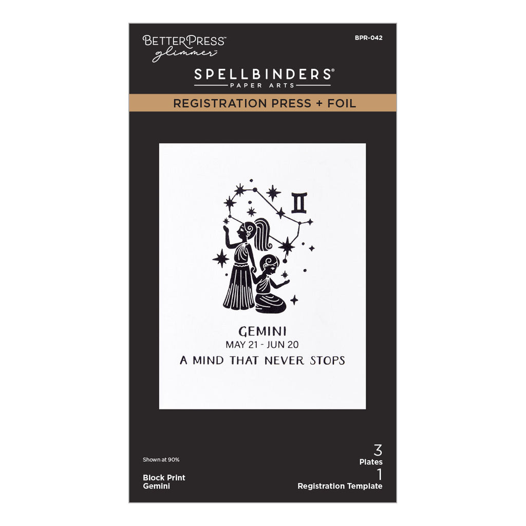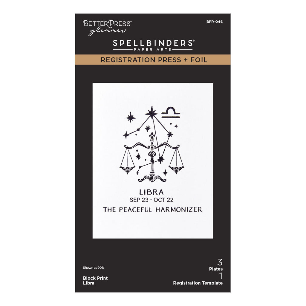 Each set has three Press + Foil plates and one acetate printed registration template come together to create a multi-color background and/or design placement of zodiac signs. Note the acetate template is only for the BetterPress System and not for the Glimmer Hot Foil System which the heat will distort the acetate.