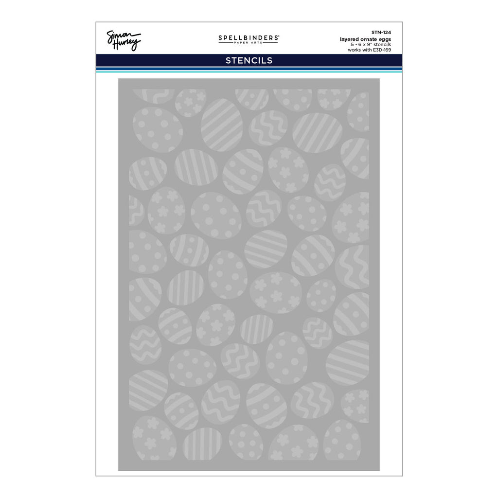 Layered Ornate Eggs Stencil is part of the Happy Spring Collection by Simon Hurley and made of durable mylar stencil material. The five stencil sheets give a detailed decorated egg background for a one-layer look or use mediums like Simon’s paste for dimension. For an embossed texture, use E3D-169 Ornate Eggs 3D Embossing Folder or purchase as a bundle with the dies in the collection, BD-1050 Happy Spring I Want It All Bundle (both sold separately).