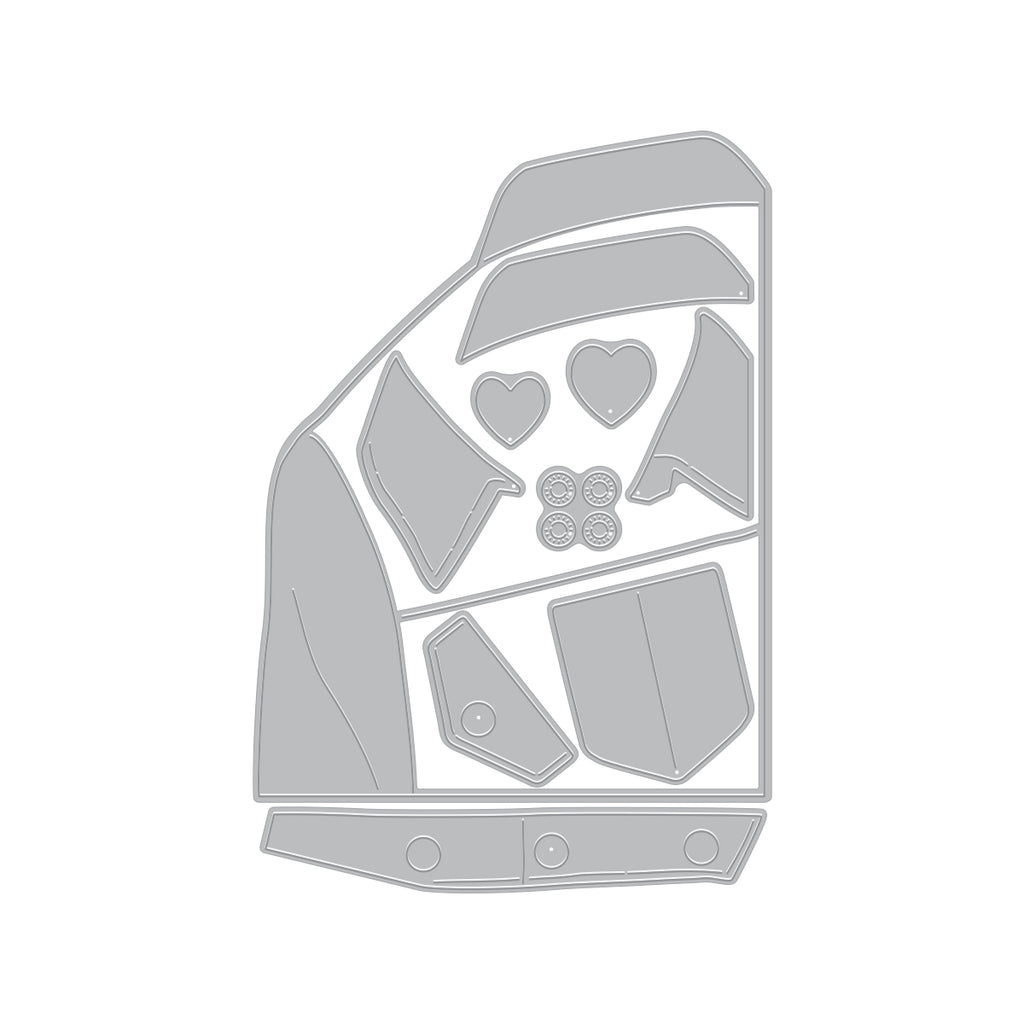 Create bold, customizable statement cards with the Jean Jacket Die Set. This detailed die set builds a classic denim jacket silhouette complete with collar, seams, pockets, and buttons—perfect for showcasing personality-packed designs.