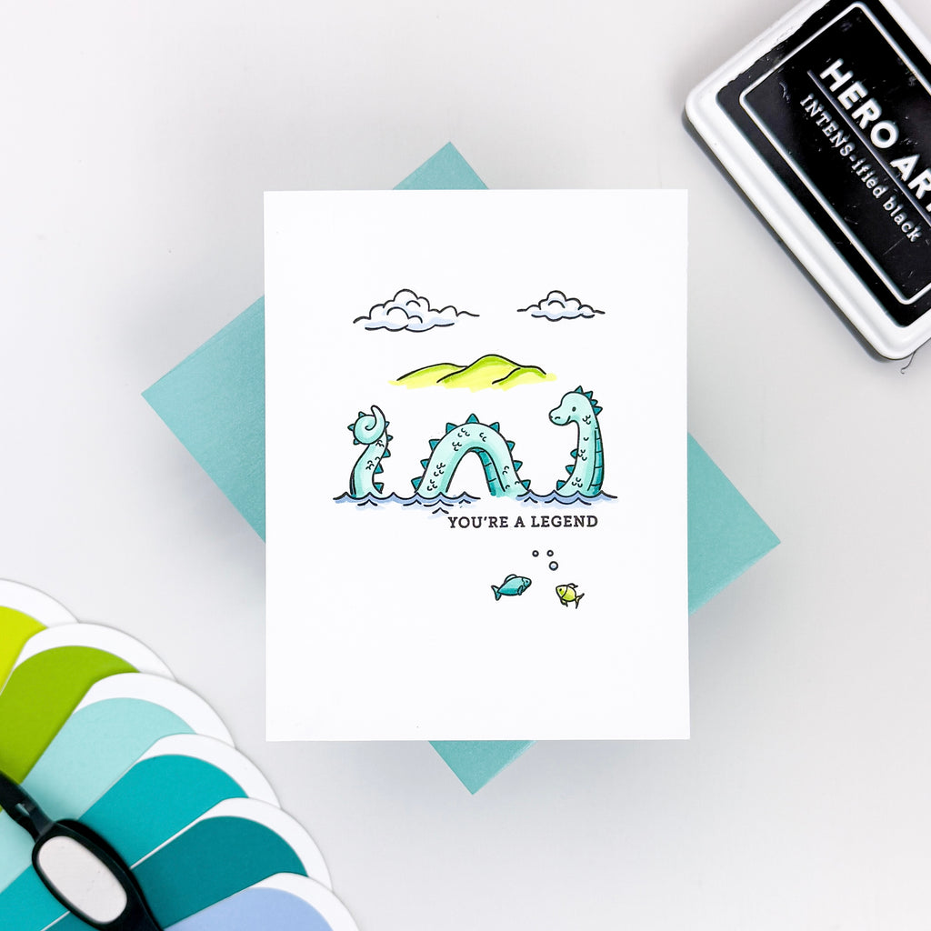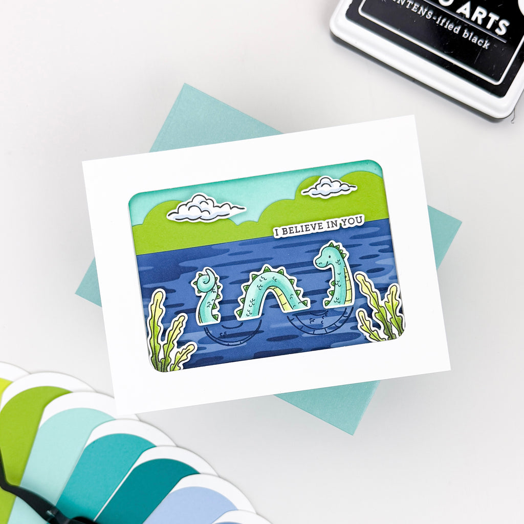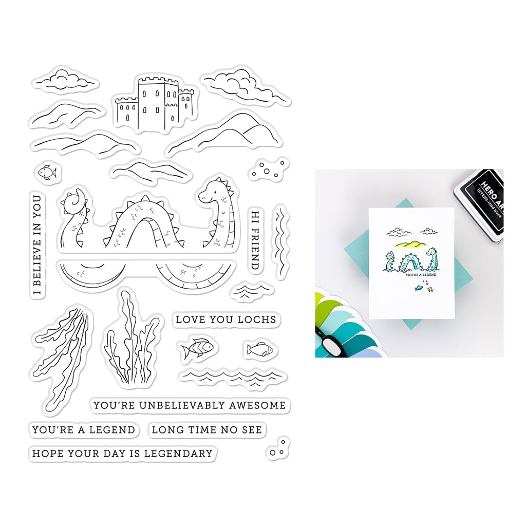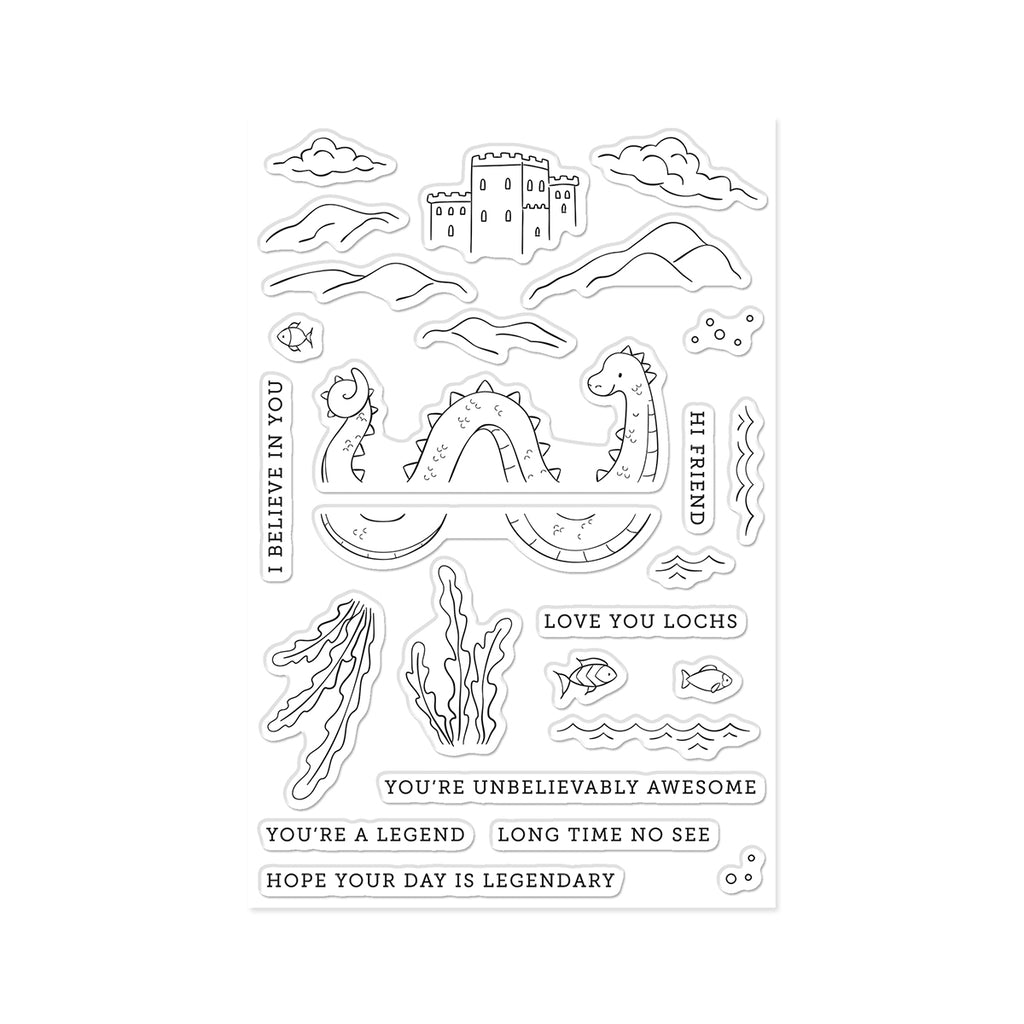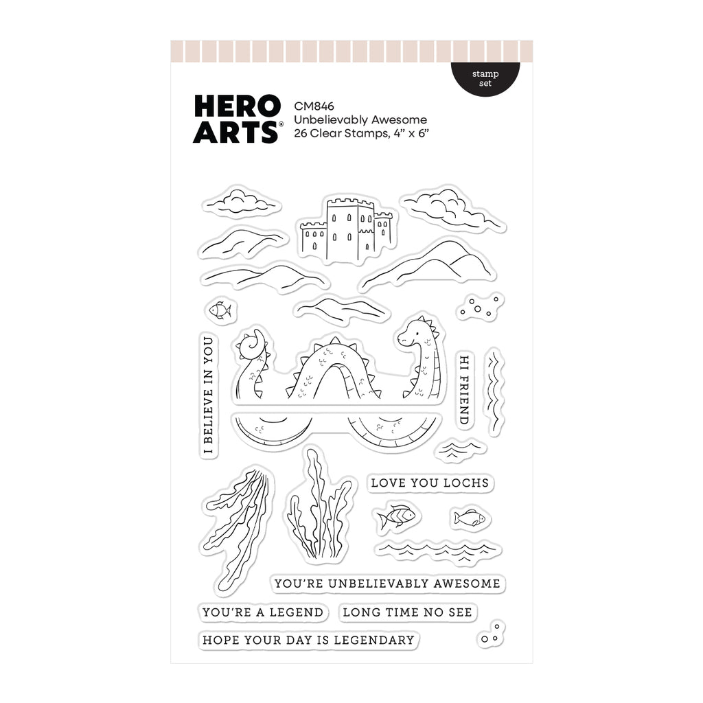 Create legendary lake scenes with the Unbelievably Awesome Clear Stamp Set. Featuring the friendly lake monster along with water, clouds, mountains, plants, and fun sentiments, this set makes it easy to build whimsical storybook landscapes.