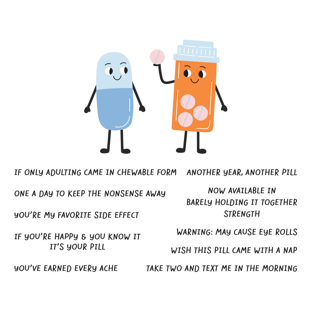 Favorite Side Effect Clear Stamp & Die Set is part of the This is Life Collection. What a couple…a capsule pill and its side kick pill bottle! Include accessories such as feet, arms and more to give them life in the set of 14 thin metal cutting dies. Add personality with punny sentiments from the set of 10 clear stamps!