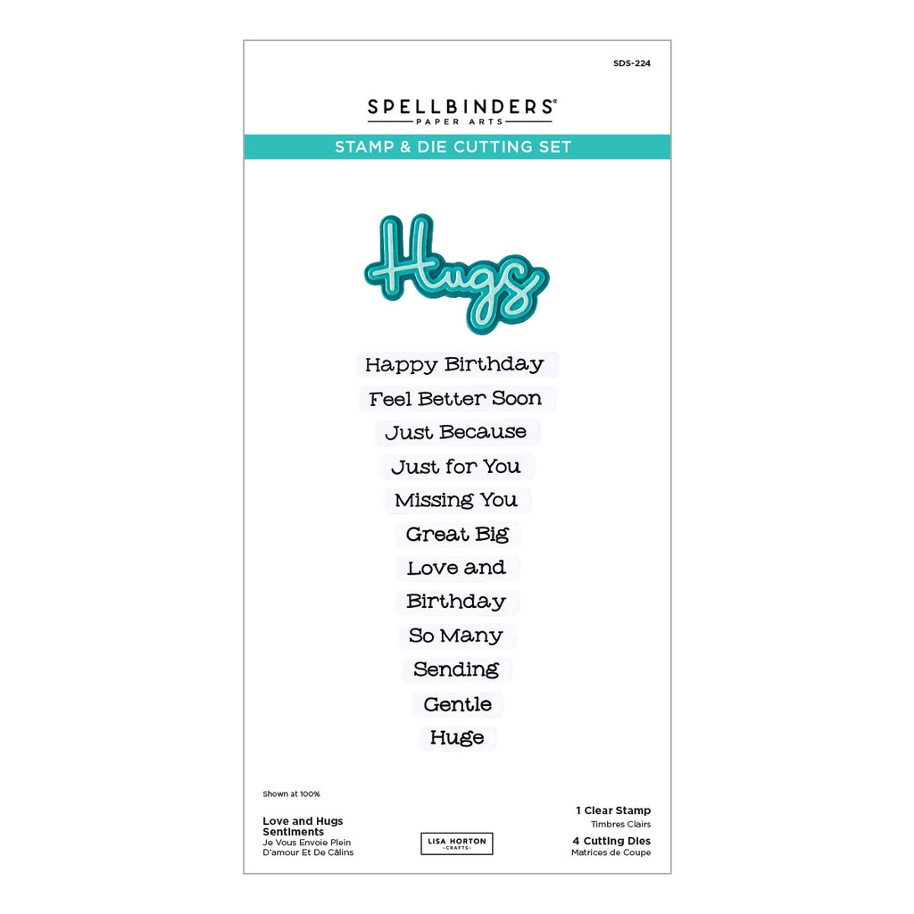 Love and Hugs Sentiments Stamp & Die Set is from the Summertime Collection by Lisa Horton There are 12 sentiment stamps that work around the word, Hugs. With this set of one clear stamp and four matching thin metal cutting dies, it cuts the 12 sentiment strips and a shadowed word, Hugs. Make each sentiment stand out even more on a card creation.
