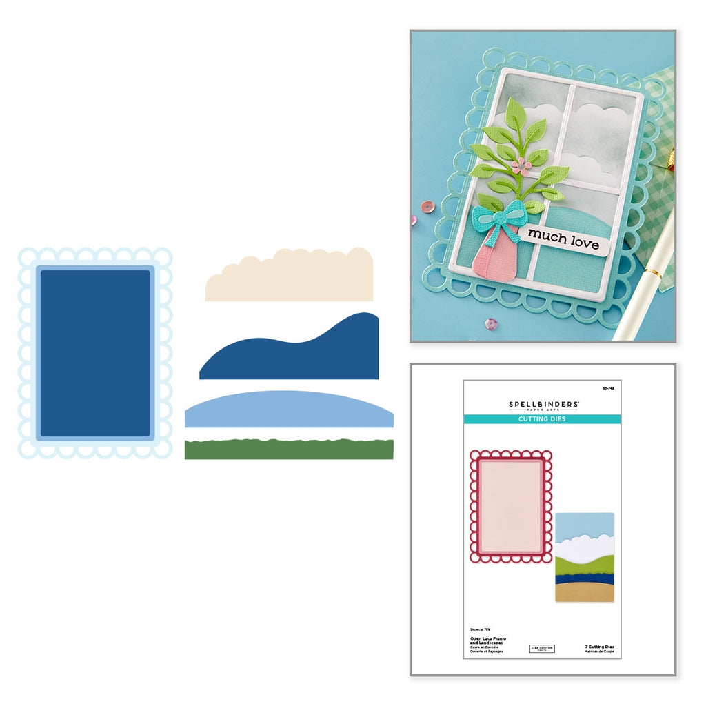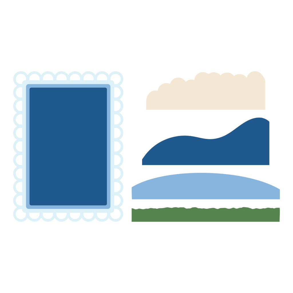 Open Lace Frame and Landscapes Etched Dies are from the Summertime Collection by Lisa Horton. Create a sweet open lace edged frame and several scenery design with this set of seven thin metal cutting dies. Also, included are four different backgrounds to fit the inside the frame: clouds, rolling hills, hill and grounds. Goes well with S4-1510 Decorative Lattice Set to work inside the frame.