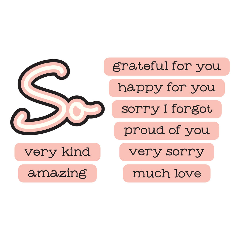 So Amazing Sentiments Stamp & Die Set is part of the Summertime Collection by Lisa Horton. There are eight sentiment stamps that work around the word, So. With this set of one clear stamp and four matching thin metal cutting dies, it cuts the eight sentiment strips and a shadowed word, So. Make each sentiment stand out even more on a card creation.