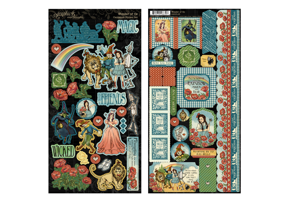 Visit with all your favorite residents of Oz in this Graphic 45 Wonder of Oz Sticker Set. With two 6” x 12” sheets of cardstock stickers in bright, vivid colors, your scrapbook pages, handmade cards and decorative tags with be packed with magic and wonder. This set of 59 stickers is full of beautifully detailed imagery including Dorothy and friends, the Wicked Witch of the West, poppies galore and themed sentiments.