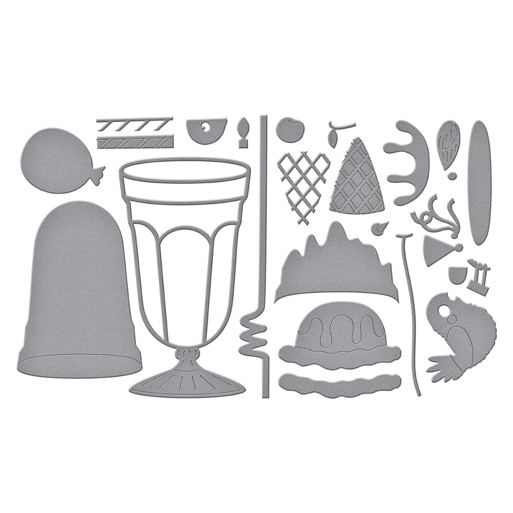 Fountain Wishes Etched Dies are from the Happier Hour Collection. When assembled, this set of 22 thin metal cutting dies creates sweet drinks based on a tall, footed fountain glass. Details include an ice cream scoop and drips to make it real! For extra fun, there are accents to add to set the vibe: straw, cherry, cookie, balloon, and more! Full of playful soda fountain puns, BP-338 Fountain Wishes Sentiments BetterPress Plates is sure to add the perfect finishing message to your project.