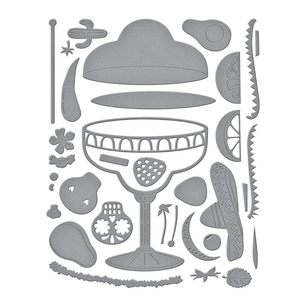 Sip Sip Ole’ Etched Dies are part of the Happier Hour Collection. When assembled, this set of 27 thin metal cutting dies creates festive drinks based on a stemmed wide rim Margarita glass. Details include a line of salt to set on the glass rim and plenty of garnishes to choose from. For extra fun, there are accents to add to set the vibe: sombrero, cactus, sugar skull, strawberry and more! Full of playful margarita puns, BP-337 Sip Sip Ole Sentiments BetterPress Plates. is sure to add the perfect finishing message to your project.