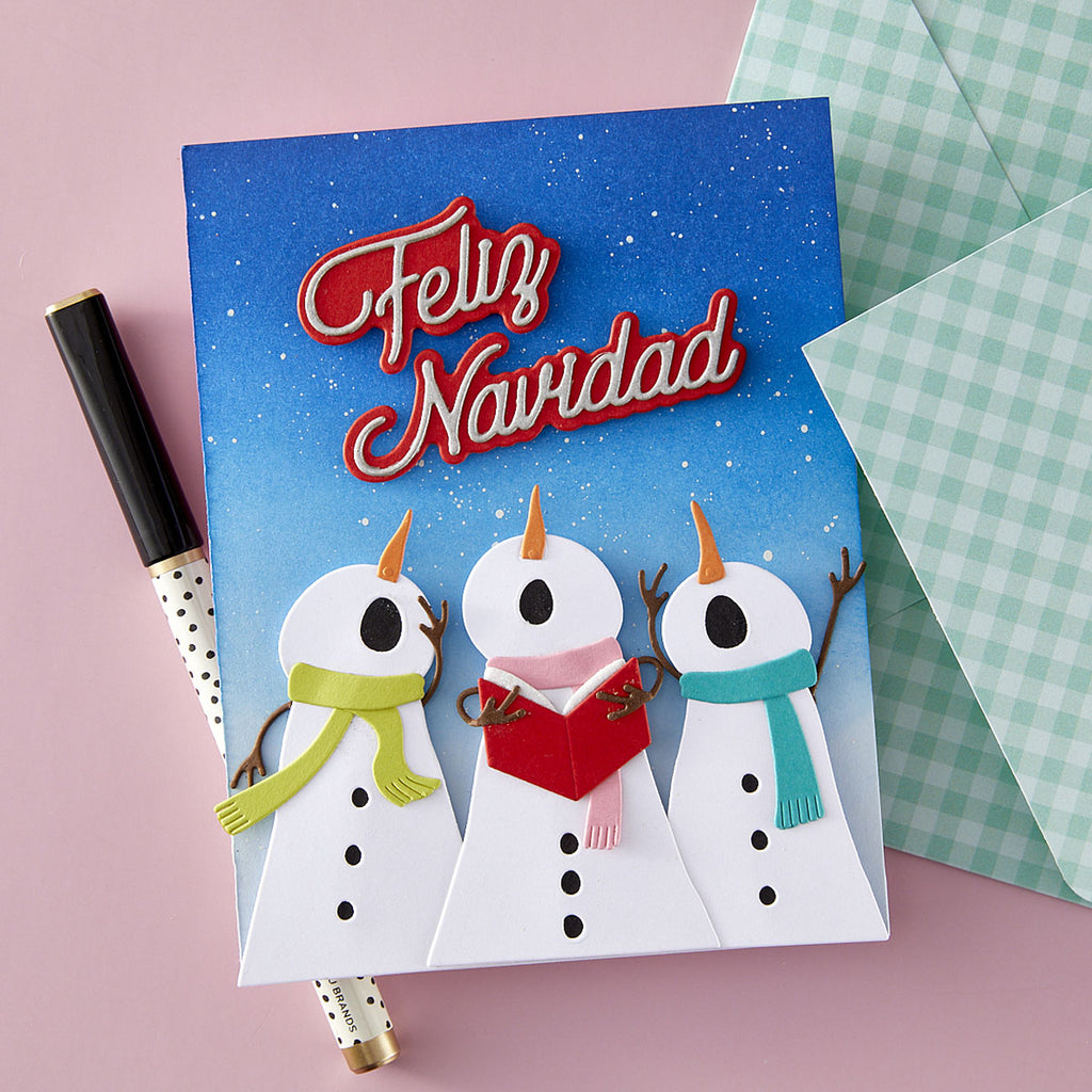 Spanish Holiday Sentiments Etched Dies are part of the International Holiday Sentiments Collection and the seasonal version of the International Sentiments Collection. This set of eight thin metal cutting dies cuts four sentiments with shadows for a bolder look. Sentiments include Feliz, Navidad, Felices and Fiestas.