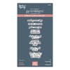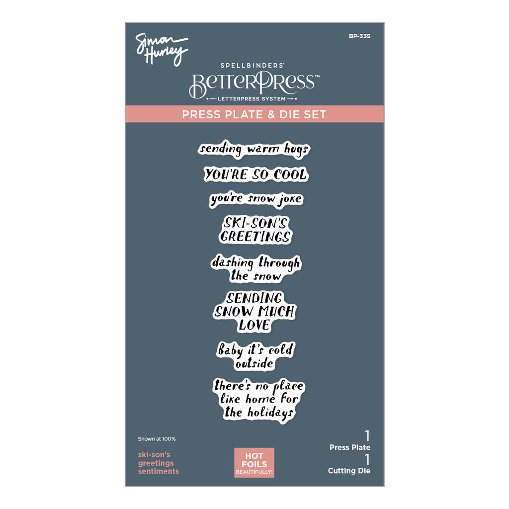 Ski-son's Greetings Sentiments BetterPress Plate & Die Set presses eight sentiments at once with one press plate, then die-cuts them all with the coordinating thin metal cutting die. A time saving set to get you started with eight sentiments. Use them individually or group them for a longer phrase. Works perfectly with the rest of this collection! Ink the plates with the BetterPress Ink to be pressed against the BetterPress Cotton Card Panel and Sheets for a crisp letterpress design.