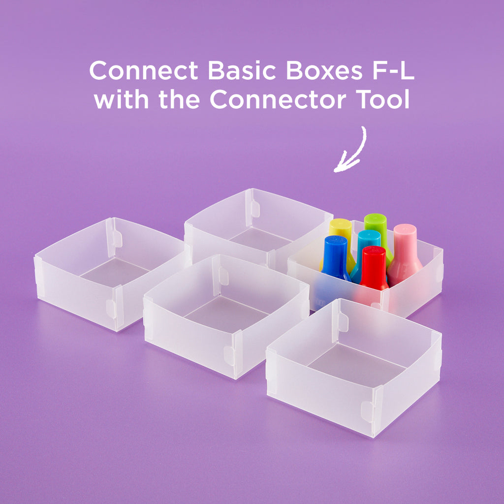 This box is part of the 1.5" high Basic Box collection, but Basic Boxes come in a variety of heights and sizes ideal for deeper drawers, shelves, cabinets, etc. Basic Box “J” works with the Creative Connector Tool & Clips to create the perfect organizer system in your kitchen drawers, desk drawers or cube style storage shelves. Use them wherever you need a smart, custom, storage solution. All 1.5" high Basic Boxes can be connected together with any other 1.5" high Basic Box using the Creative Connector Tool and Clips. All Basic Boxes must be of the same height in order to use the Creative Connector Tool to connect them together.