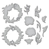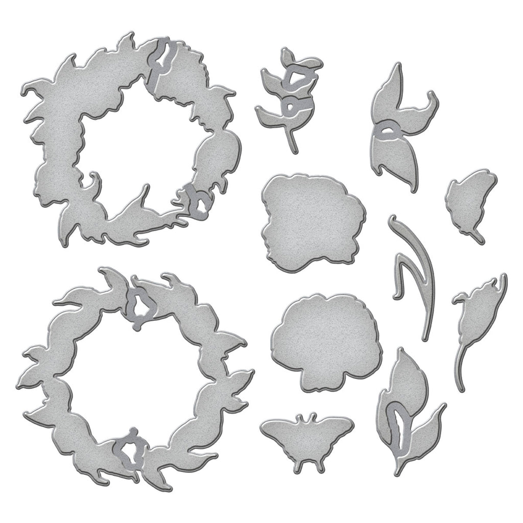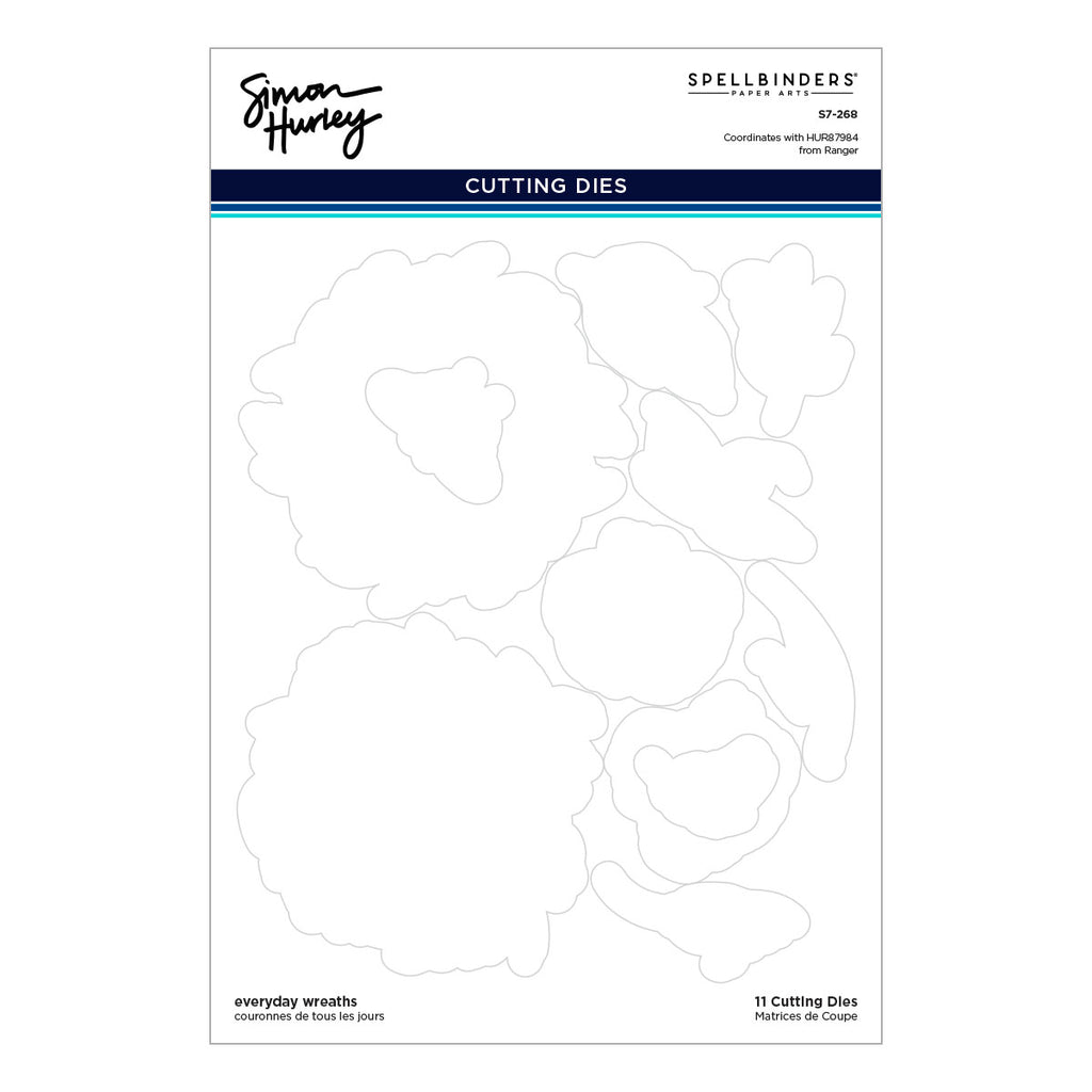 Everyday Wreaths Etched Dies by Simon Hurley is a set of eleven thin metal dies that coordinate with HUR879841 Ranger Everyday Wreaths Clear Stamp Set by Simon Hurley create. Create elegant floral projects with this lovely set of two wreaths - one made of sweet leafy branches and the other blooming with roses. You'll also get separate roses, greenery and even a butterfly to complete your projects. The dies in this set cut out all the greenery for maximum versatility.