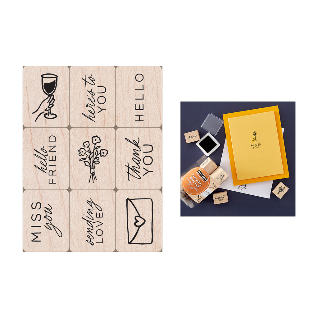 The Everyday Mini Tub offers 9 versatile stamps to brighten up anyone’s day. With friendly sayings, like “hello FRIEND,” “here’s to YOU,” and “sending LOVE,” plus cute icons, and a hand drawn design, it’s ideal for journals, notes, planners, and more. These little stamps add a meaningful touch to life’s everyday moments.