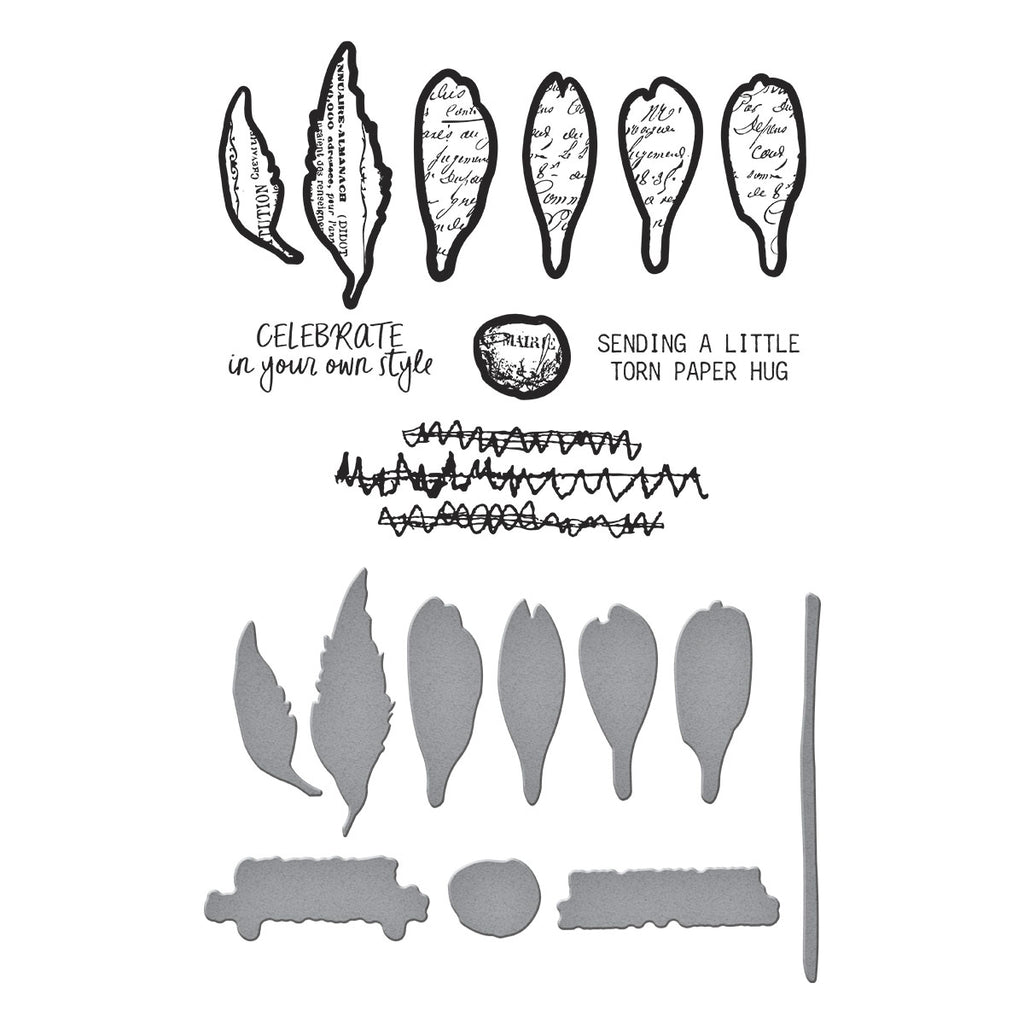 Sculpted Scripted Floral Clear Stamp & Die Set is part of the Beautifully Imperfect Collection. The set of 10 clear stamps and 10 thin metal cutting dies, seven clear stamps and their matching dies make a fabulous, scripted flower. There is also a stem die to add to the flower. Also, two phrase stamps and their matching dies are included: Sending a Little Torn Paper Hug and Celebrate in Your Own Style. The tenth stamp is a distressed line pattern. The stamps are made in the USA with high-quality polymer for perfect impressions every time. Designed to be used with a clear stamp block.