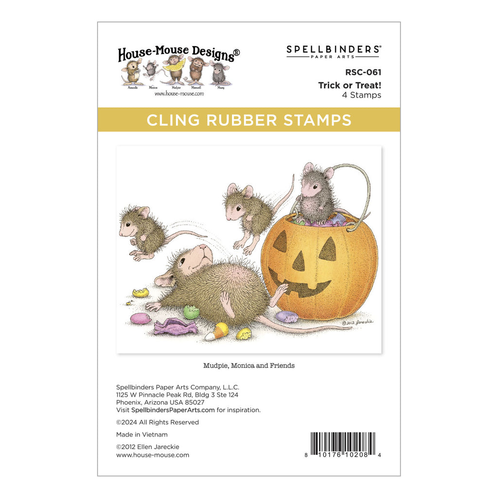 Trick or Treat! Cling Rubber Stamp Set is part of the House-Mouse Tree-mendous Christmas Collection. Mudpie, Monica and Friends are checking out their hauls from their treat or treating outing! Maybe too much sugar is involved? In addition to the focal point image, the set of four stamps includes three sentiments: Happy Halloween!, Official Candy Taster, and Trick or Treat! Designed to be used with a stamp acrylic block. The House-Mouse Designs® is created and copyrighted by the talented Ellen Jareckie. It is a wonderful collaboration with Spellbinders, and we are excited to share a warm and cozy holiday series of designs with the Tree-mendous Christmas Collection!