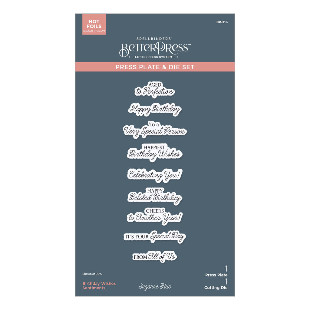 Birthday Wishes Sentiments BetterPress Plate & Die Set has one press plate with nine birthday sentiments and a corresponding thin metal cutting die cuts all the sentiments in one pass. From 'Happiest Birthday Wishes' to 'It’s Your Special Day' to 'Aged to Perfection,' they can be added to many of your card creations. Ink the plates with the BetterPress Ink to be pressed against the BetterPress Cotton Card Panel and Sheets for a crisp letterpress design.