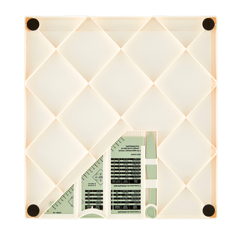 Lisa Horton Special Edition 12 x 12” Scoring Board with sage green triangle ruler and scoring tool. Make your paper folds with accuracy and precision using this simple to use tool. The actual scoring surface is 12 x 12 inches with scoring guides every 1/8 inch. In addition to the scoring board, it includes a special sage green score & fold tool and triangle ruler for making envelopes & boxes. The score & fold tool and triangle ruler conveniently slide and click in to place on the backside of the board for storage. The tools coordinate perfectly with your Lisa Horton Crafts Special Edition Platinum Six Die Cutting and Embossing Machine. This lightweight board works for various sizes, all the way up to 12 x 12". Easy to use for cardmaking, other paper crafting, school projects and more!