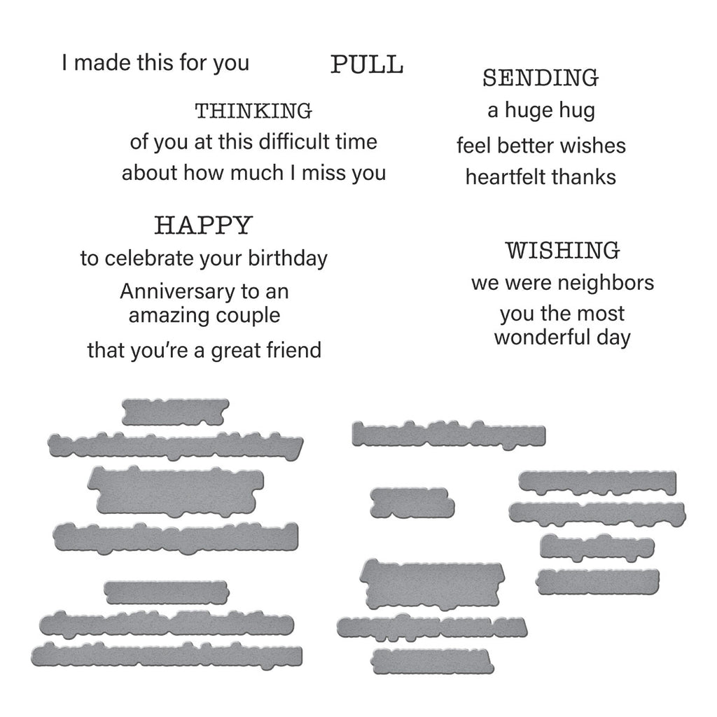 Tabbed In & Out Sentiments Clear Stamp & Die Set is from the Tabbed Classic Collection by Wendy Vecchi and is a set of six clear stamp of words and sentiments with its matching six thin metal cutting dies. Each uppercase “main” words (SENDING, THINKING, HAPPY and WISHING) has supporting sentiments grouped together on a clear stamp. Stamp and then cut them all at once with the matching die for lots of sentiment options. Also, included are the word PULL and the sentiment “I made this for you,” in both stamp and die format. This set works perfectly with S6-260 Essential Envelope Every Day Add-Ons Die Set.