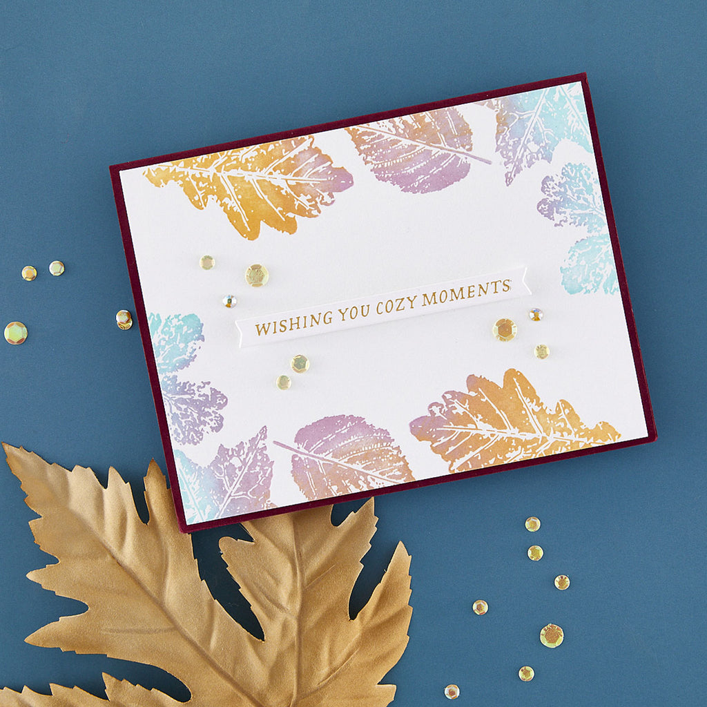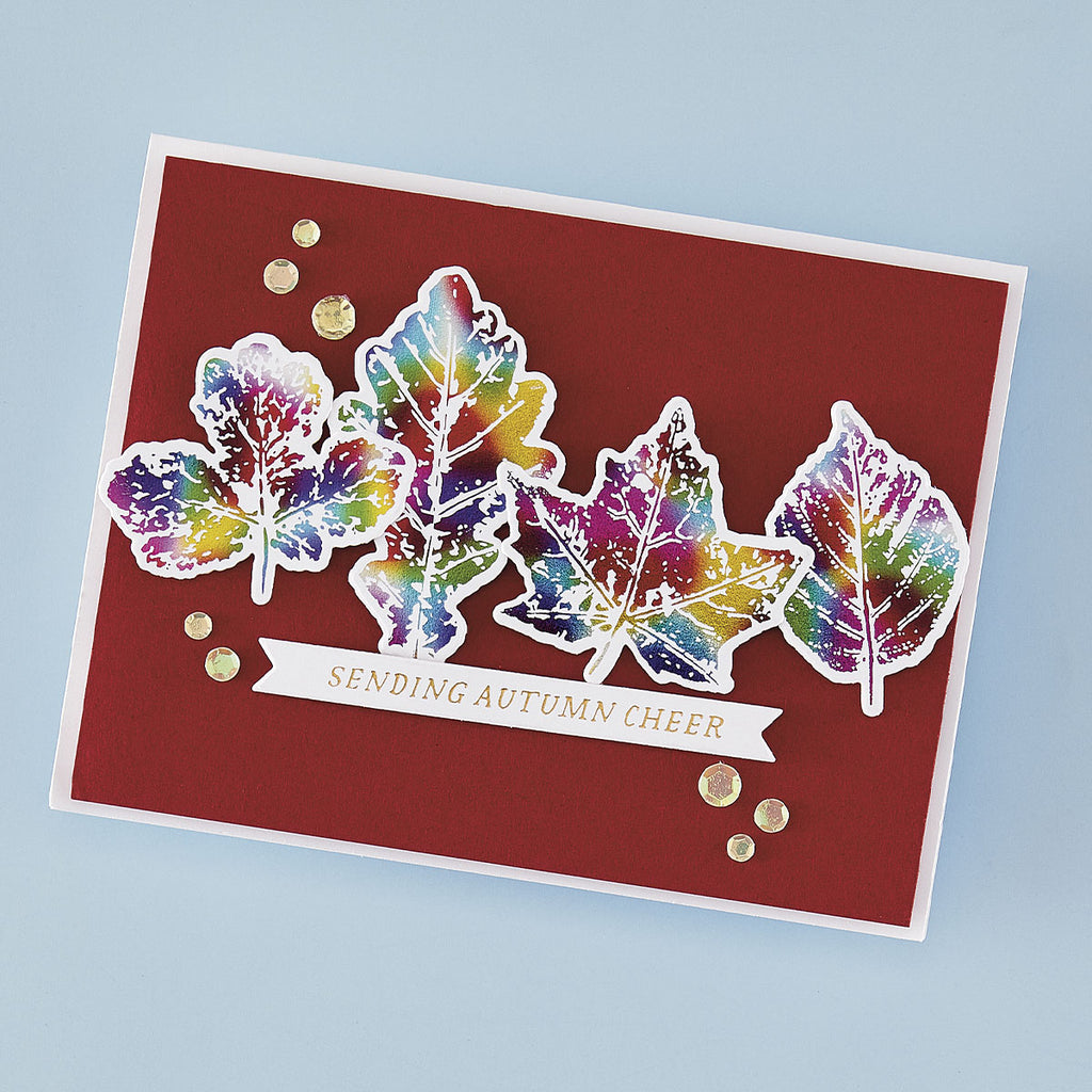 Autumn Cheer Press Plate & Die Set is the September 2025 release for the BetterPress Society, available exclusively to independent retailers. This set of 8 press plates and four dies presses out four different fall leaves in an organic style, reminiscent of DIY paint prints. Cut out the leaves with the coordinating dies for extra dimension and creative possibilities. Four sentiment strips complete the set, including "Wishing You Cozy Moments," and "Sending Autumn Cheer."