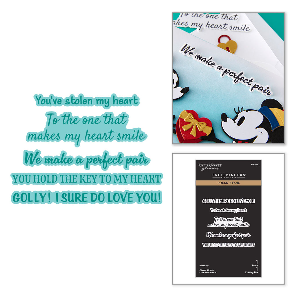 Classic Mouse Love Sentiments Press + Foil Plate & Die Set is from the Classic Mouse Love Collection. What a great time saver when it comes to making sentiments! The one Press & Foil plate imprints and/or foils five sentiments at the same time. The matching thin metal cutting die cuts each sentiment perfectly and with love! Sentiments include Golly! I sure do love you!, You’ve stolen my heart, To the one that makes my heart smile, We make a perfect couple, and You hold the key to my heart.