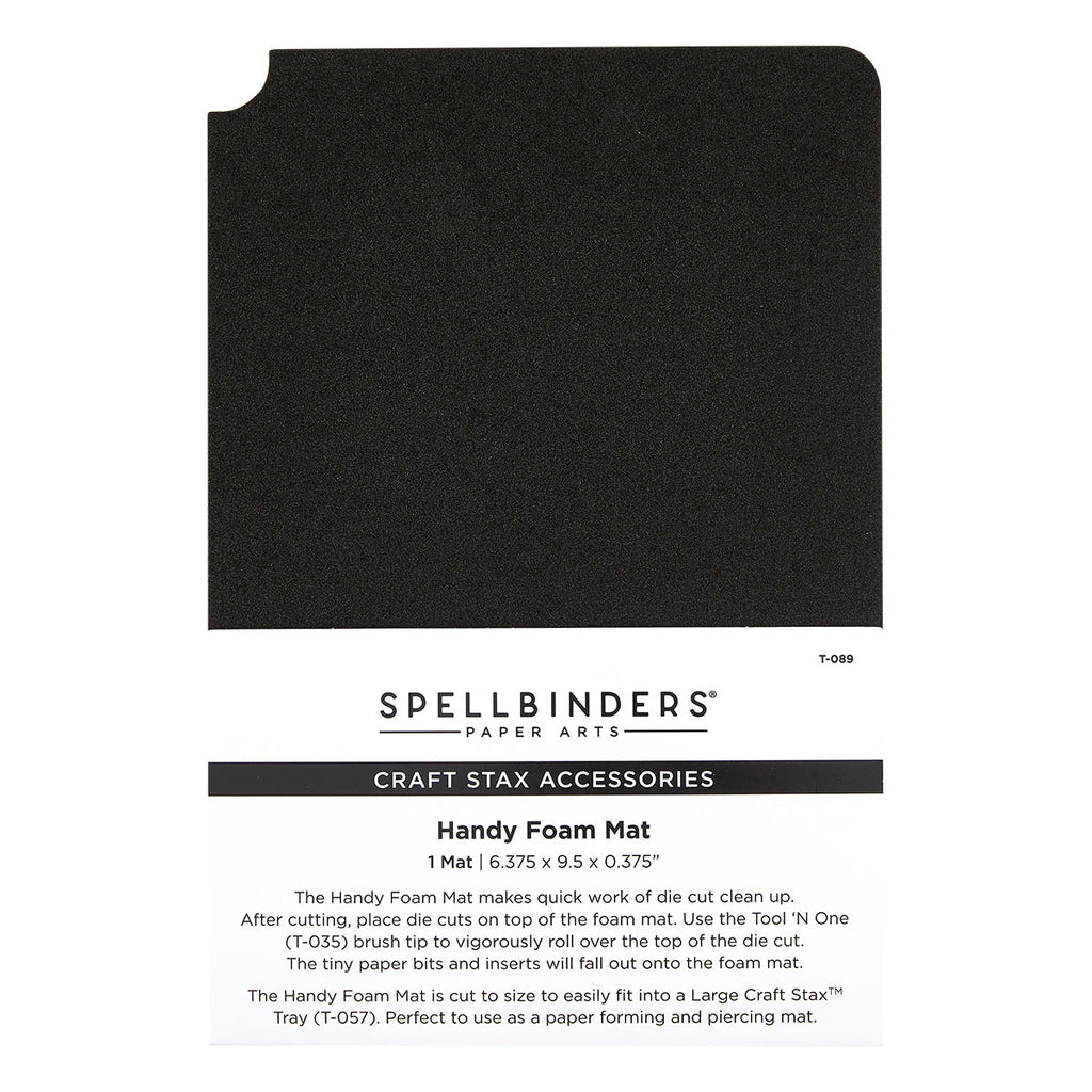 Handy Foam Mat is a 6.375 x 9.5 x 0.375 in./16.19 x 24.13 x 0.95 cm mat makes quick work of die-cut clean up. After die-cutting, place the die-cut shape on top of the foam mat. With the T-035 Tool ‘N One’s brush tip, vigorously roll over the top of the cut shape to loosen tiny paper bits and inserts for them to fall out onto the foam mat. The Handy Foam Mat is cut to easily fit a T-057 Large Craft Stax™ Tray. Also, perfect to use as a paper forming and piercing mat.