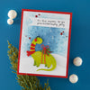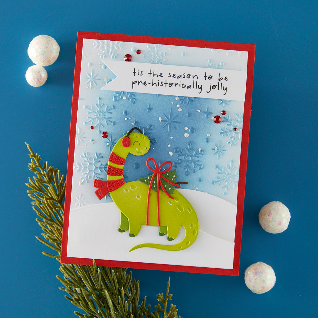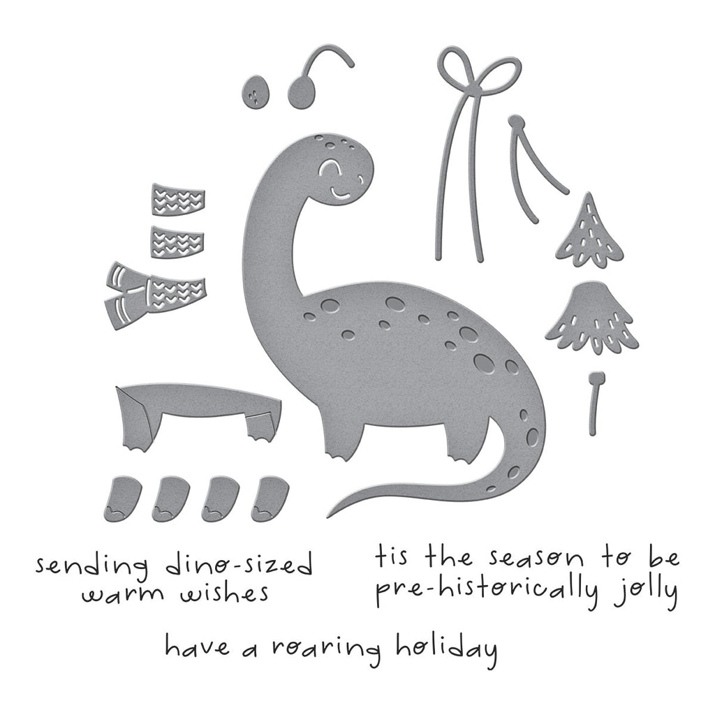 Dino-Sized Holiday Stamp & Die Set includes a set of eight thin metal cutting dies and three clear stamps. The dies assemble a cute dinosaur dressed warmly in a scarf and earmuffs… with a Christmas tree packed on its back to make sure he's for the holidays. There are three sentiment stamps fitting for the occasion: "tis the season to be pre-historically jolly," "have a roaring holiday" and "sending dino-sized warm wishes." The finished Dinosaur measures approximately 2.55 x 2.90 in./6.40 x 7.40 cm.