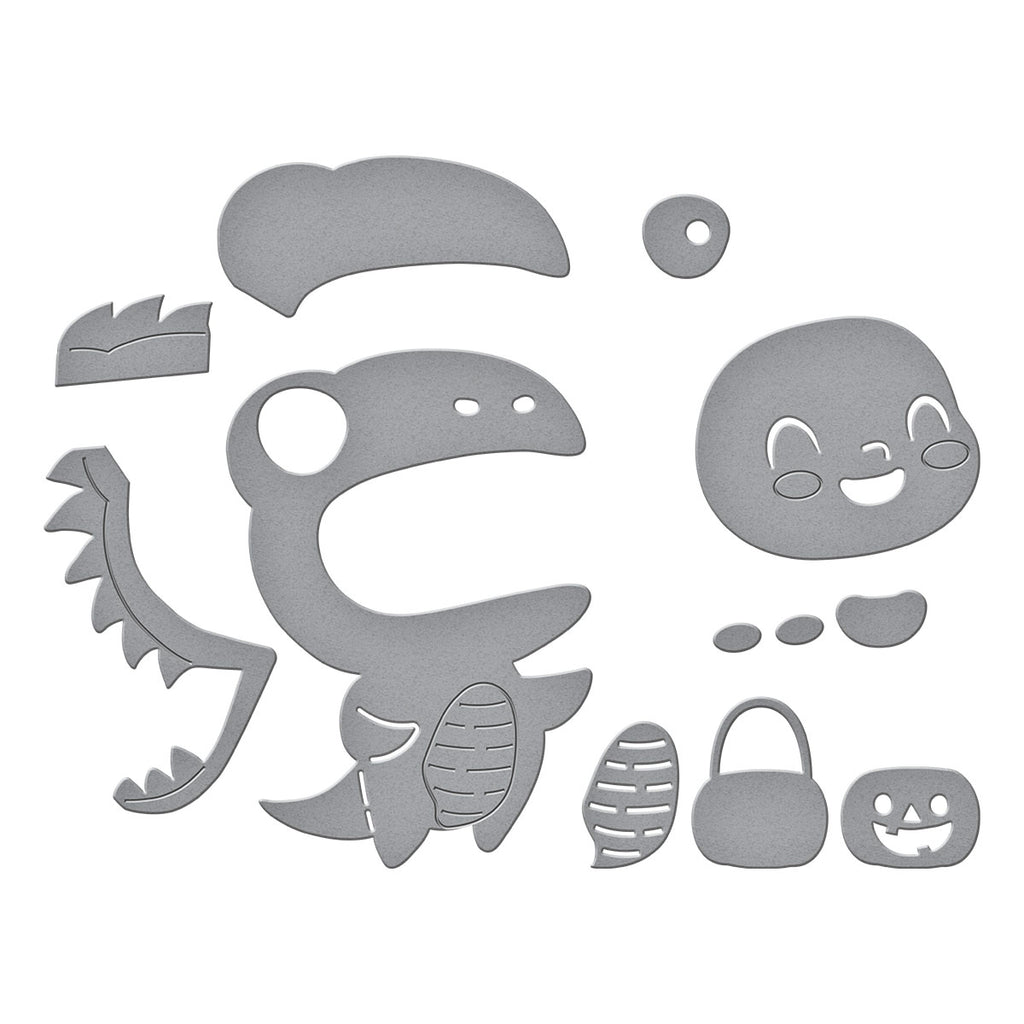 Get ready for trick or treating with Dragon Boo Etched Dies. This set of 7 thin metal cutting dies come together to create a costumed cutie, complete with pink cheeks and pumpkin candy bucket. Decked in a fun dinosaur suit with spikes, this little guy is ready for some spooky adventures!