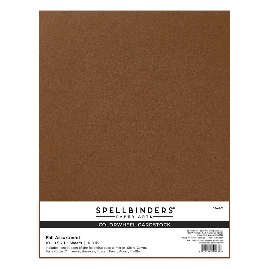 Fall Assortment ColorWheel Cardstock is a pack of 10 sheets of cardstock 100 lb or 270 gsm in thickness. The cardstock is smooth on both sides and has a solid color core. Every creation starts with a great foundation of high-quality cardstock, so be sure to add this pack to your supplies! Enjoy creating with hues of this Fall-themed pack that contains one sheet each of Merlot, Sicily, Carrot, Terra Cotta, Cinnamon, Beeswax, Tuscan, Fawn, Acorn, and Truffle.