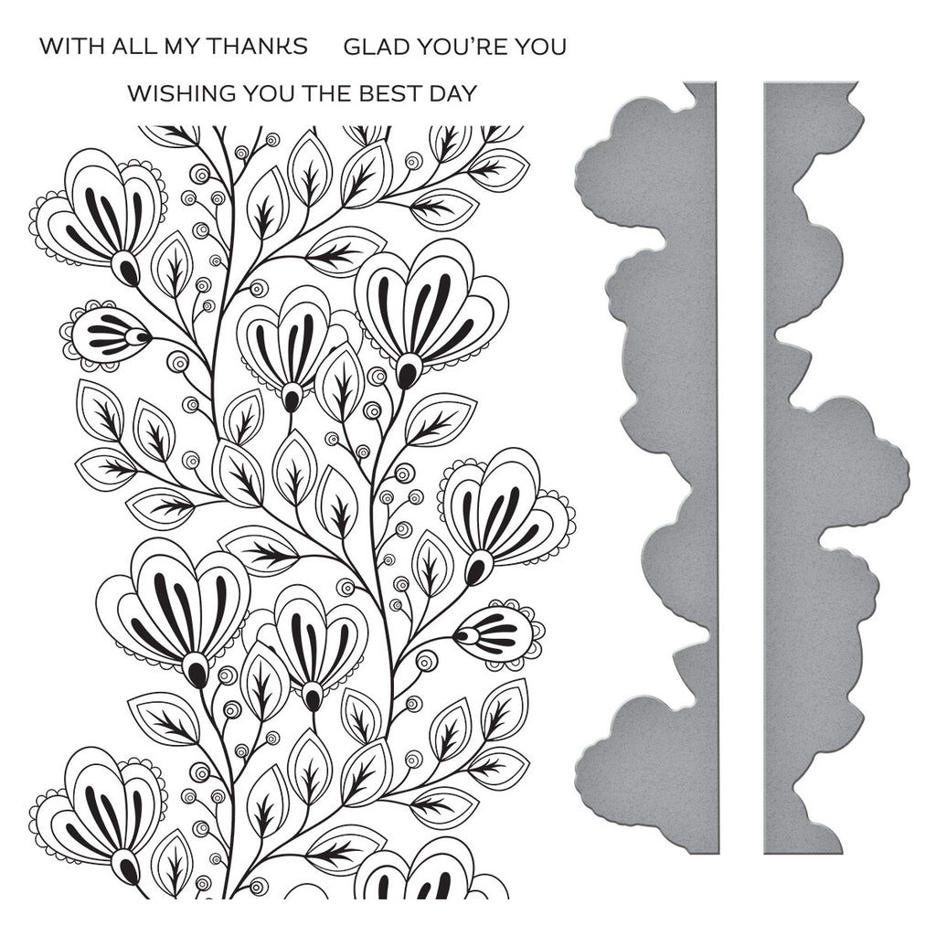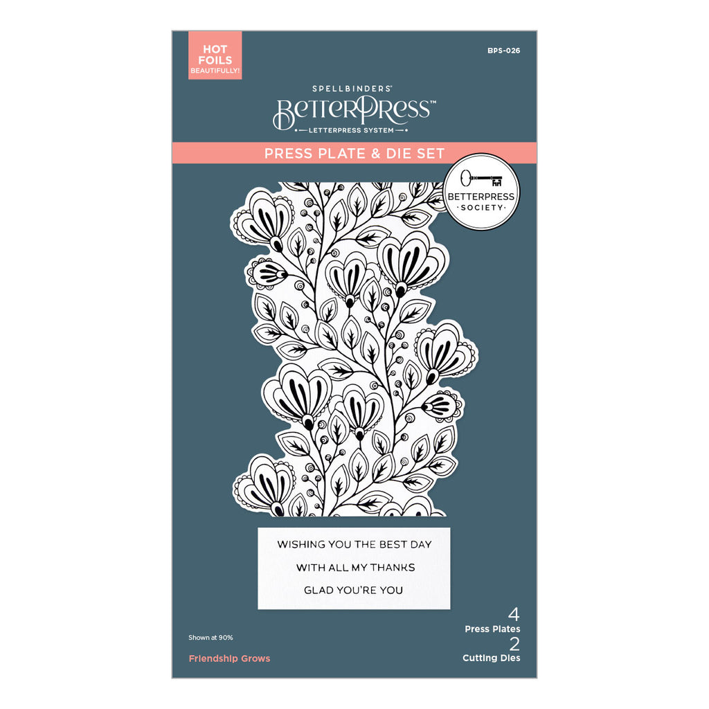 Friendship Grows Press Plate & Die Set is the November 2025 release for the BetterPress Society, available exclusively to independent retailers. Flowers are blooming up your projects with this beautiful 4" x 5.5" plate. These stylized blossoms twine together with leaves and buds to make a stunning design perfect for all kinds of occasions. The set also includes two dies to cut along wither edge of the design, making this plate versatile to try many compositions. Cut along both edges to make a pop up band for the center of a card front, or cut only one side for a fresh look. You'll also get three sentiment strips, "WISHING YOU THE BEST DAY," "WITH ALL MY THANKS," and "GLAD YOU'RE YOU."