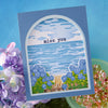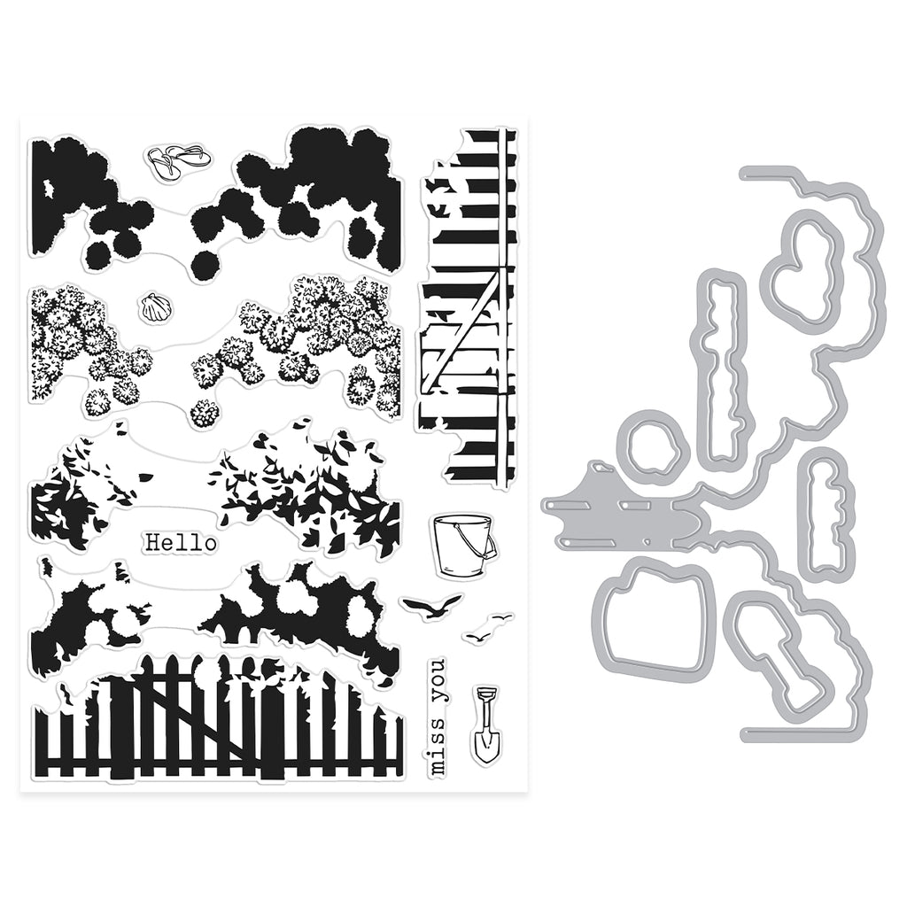The Coastal Blooms HeroScape Stamp & Cut Set captures the breezy charm of a blooming seaside garden with depth, dimension, and natural beauty. This 6" x 8" clear stamp set features multi-step layering stamps that build a vibrant hydrangea-filled fence line, along with garden accessories and two versatile sentiments.