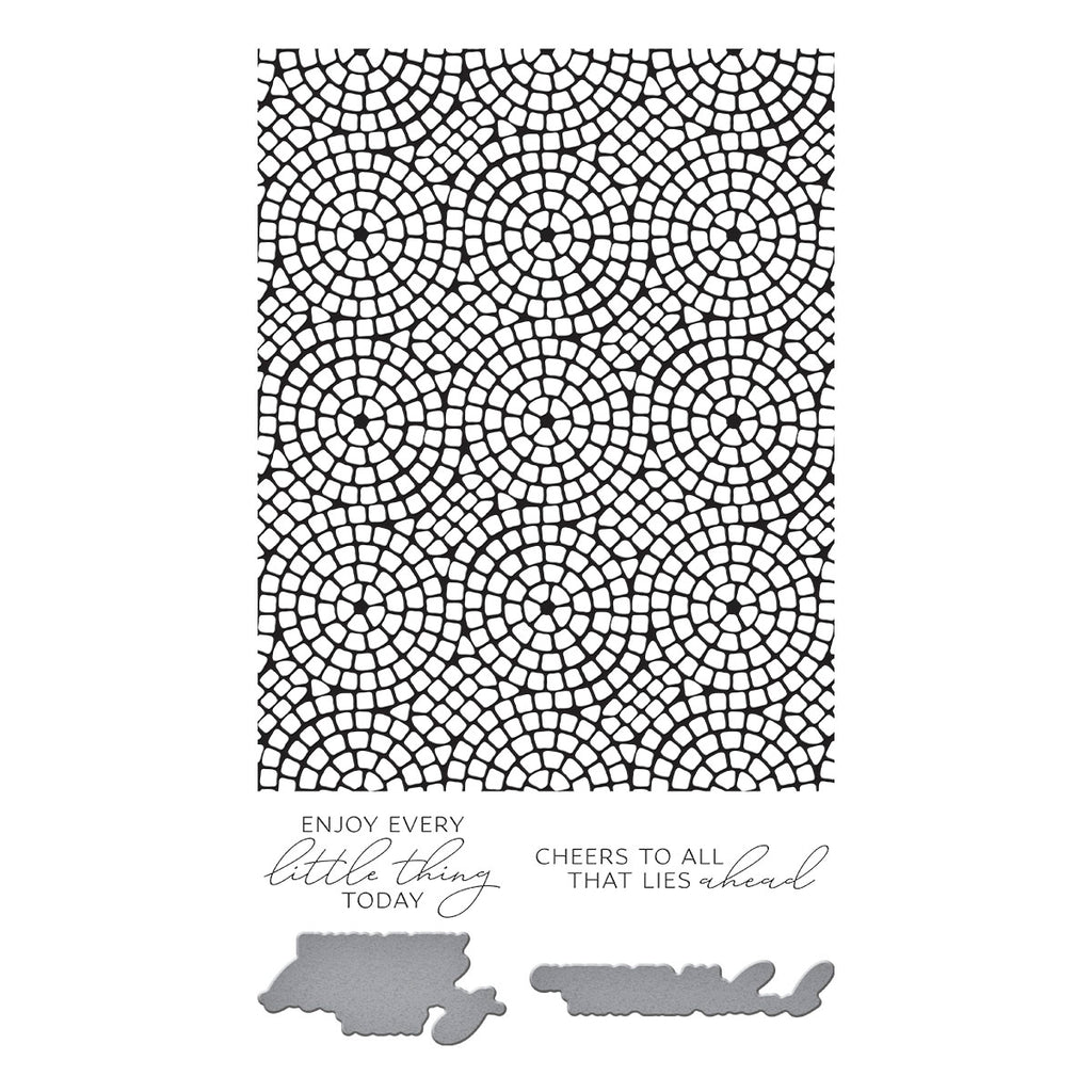 The main plate showcases a flowing pattern of circular spirals and curving lines—perfect for creating elegant backgrounds or striking focal points. The two coordinating sentiments, “Cheers to all that lies ahead” and “Enjoy every little thing today,” are beautifully rendered in a sweeping script paired with clean capital letters. Matching dies are also included to cut each sentiment out.