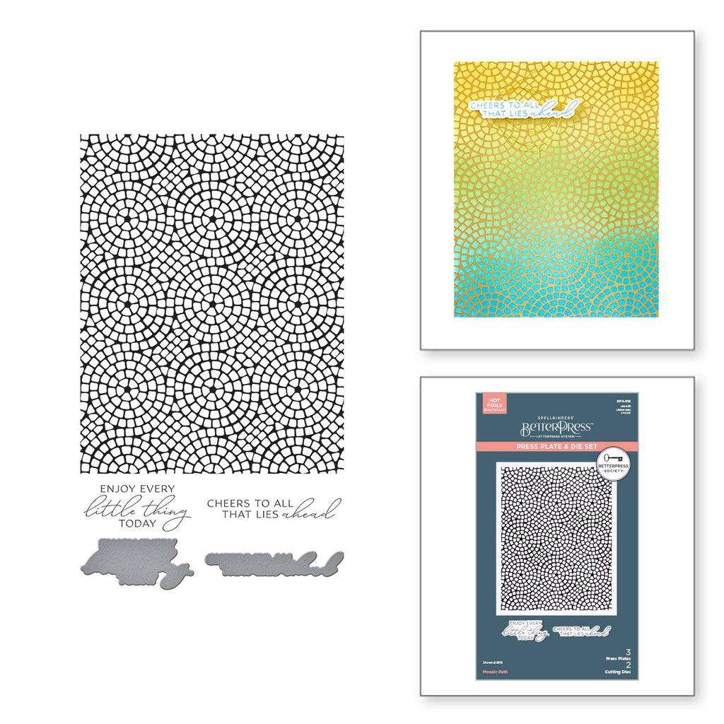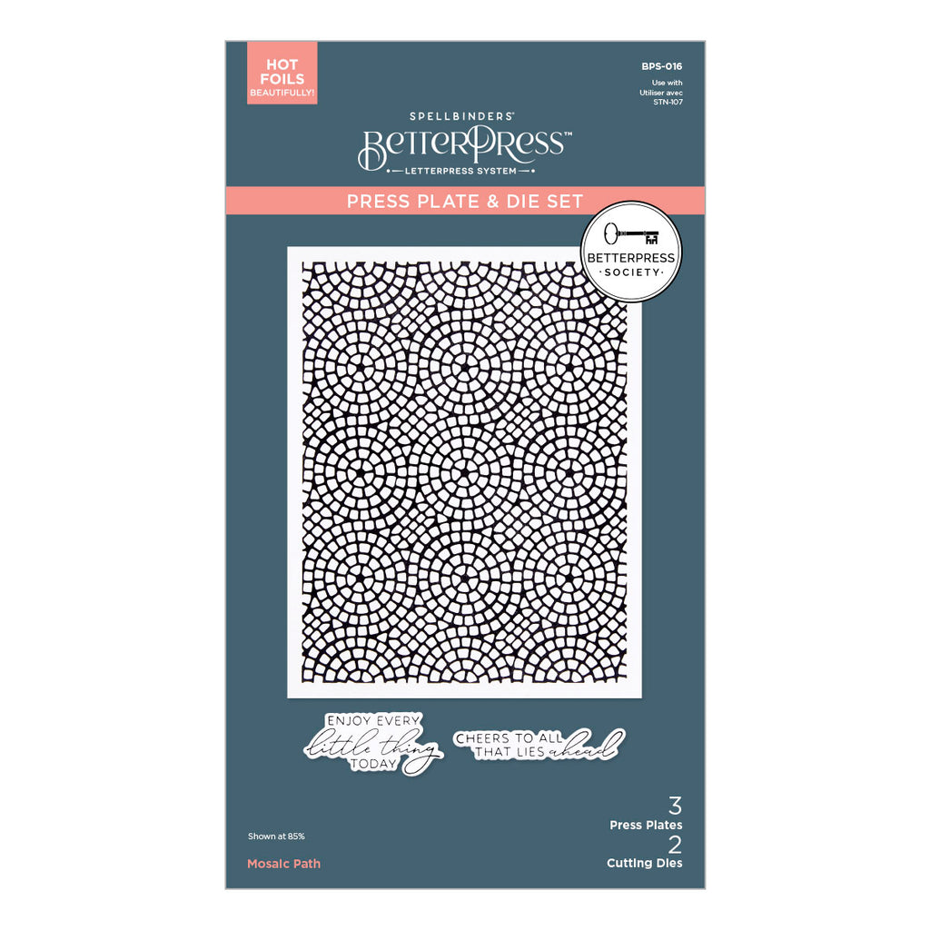 Mosaic Path Press Plates is the May 2025 release for the BetterPress Society, available exclusively to independent retailers. This set includes three press plates: one large A2-sized plate featuring an intricate, detailed design reminiscent of mosaic tile, and two sentiment plates.