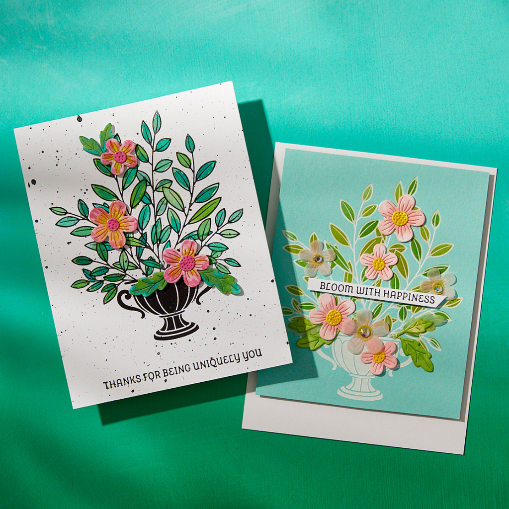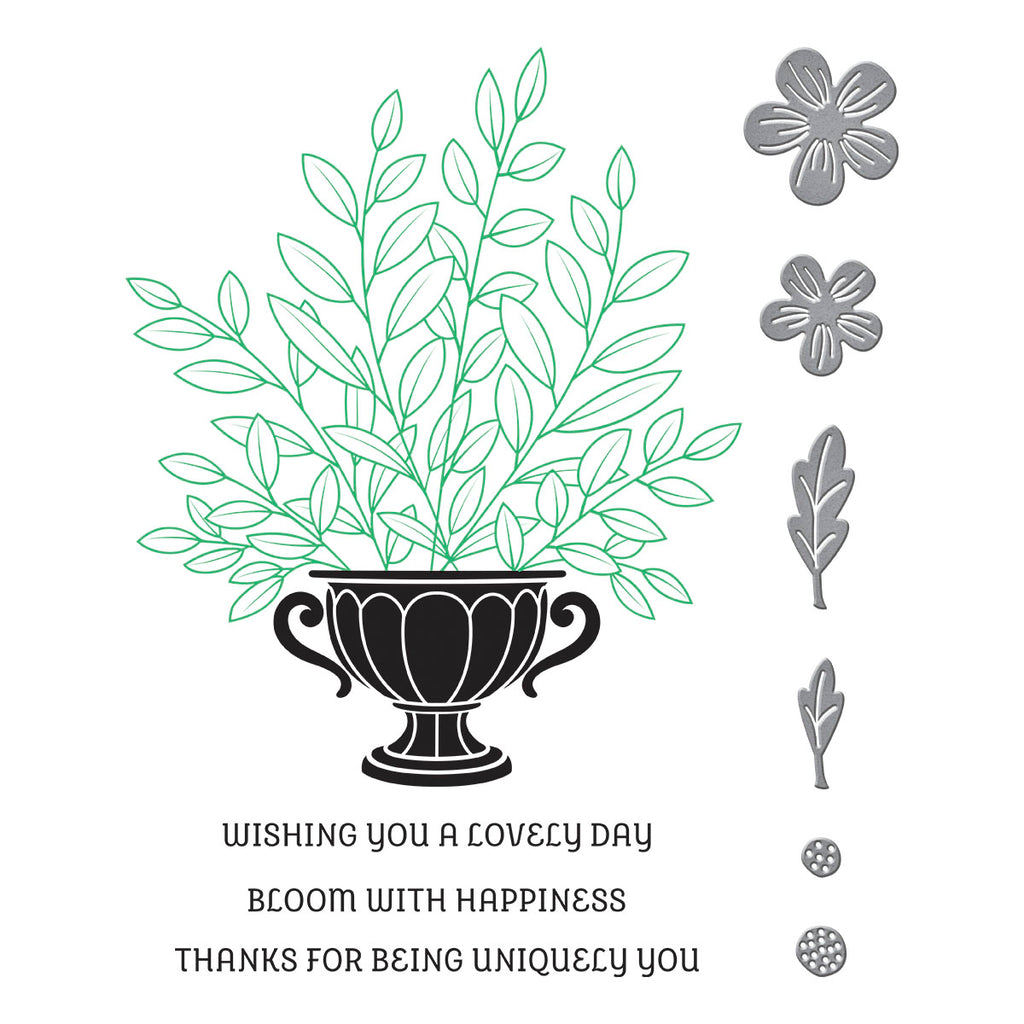 Uniquely You Press Plate & Die Set is the January 2025 release plate for the independent retailers' exclusive BetterPress Society. This set of five press plates comes together with the acetate registration template to create a lovely vase full of leaves. Make the leaves bloom with the included dies that cut out two blossoms and leaves for added dimension and charm. The three sentiments in the sent include 'Bloom With Happiness,' 'Thanks for Being Uniquely You,' and 'Wishing You a Lovely Day.'